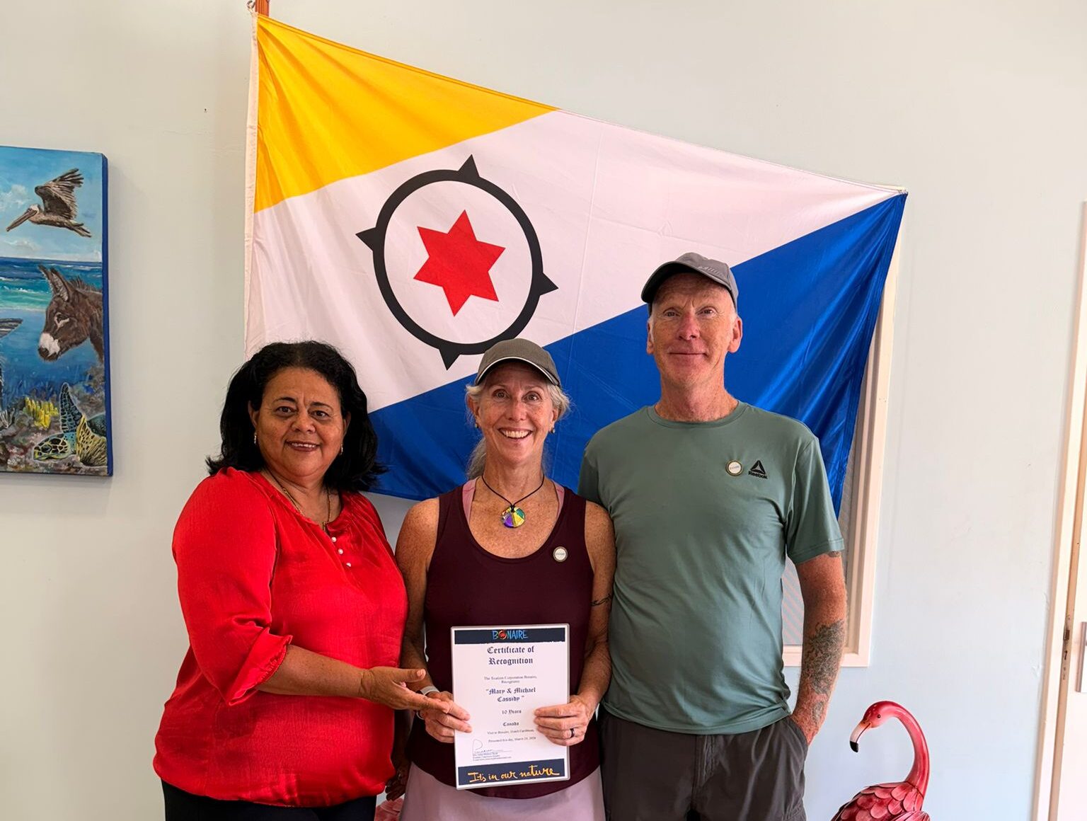 Last Monday, March 9, Tourism Corporation Bonaire (TCB) honored Lorraine and Alan Felstead as Bonaire Ambassadors. They have been visiting Bonaire for 22 years and, throughout those years, have stayed at various accommodations on the island.