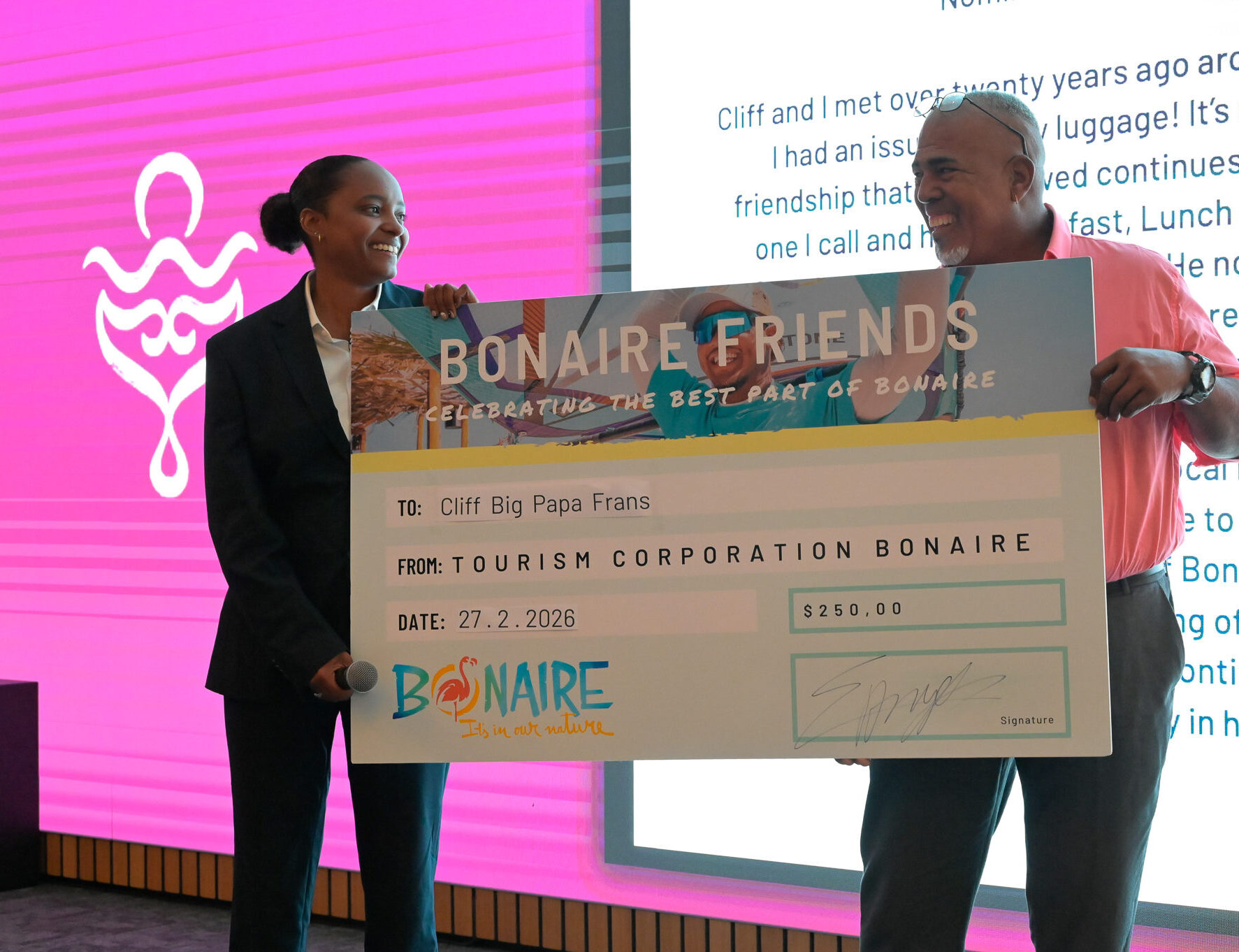 Dee Pedersen was nominated by Tom Darrow, a long time Bonaire Ambassador, for her outstanding contribution to the tourism industry on the island.