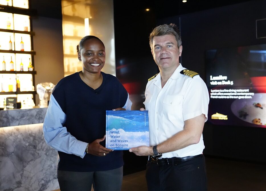 The vessel, carrying 179 passengers and 196 crew, under the command of Captain Erwan Le Rouzic, was warmly received by Tourism Corporation Bonaire (TCB), together with the Harbor Master and local agent Maduro, with a ceremonial welcome recognizing this first call.
