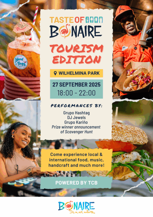 We invite all Bonaire residents and visitors to join us for a fun evening on Saturday, September 27, 2025, at the fourth Taste of Bonaire, edition Tourism in Wilhelmina Park.